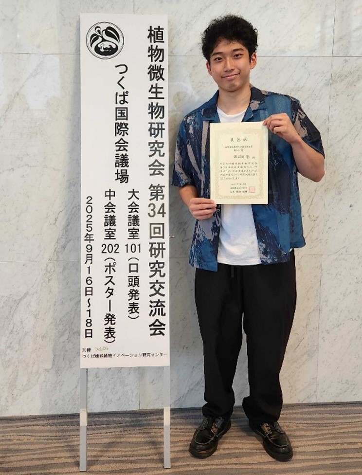 本学科連携大学院の菅野研究室 修士2年の諏訪園 悠さんが植物微生物研究会 第34回研究交流会において学生優秀発表賞 新人賞を受賞